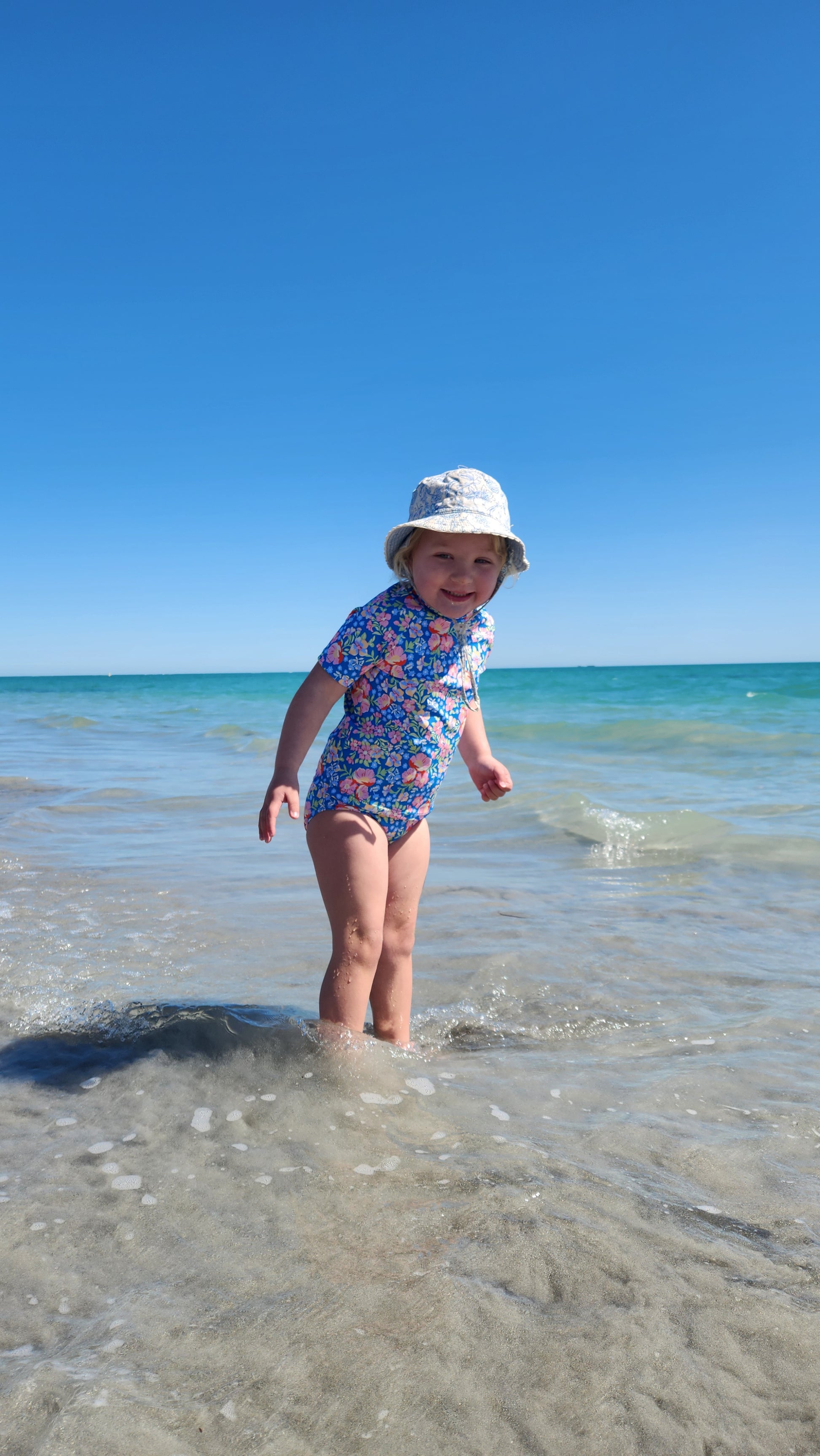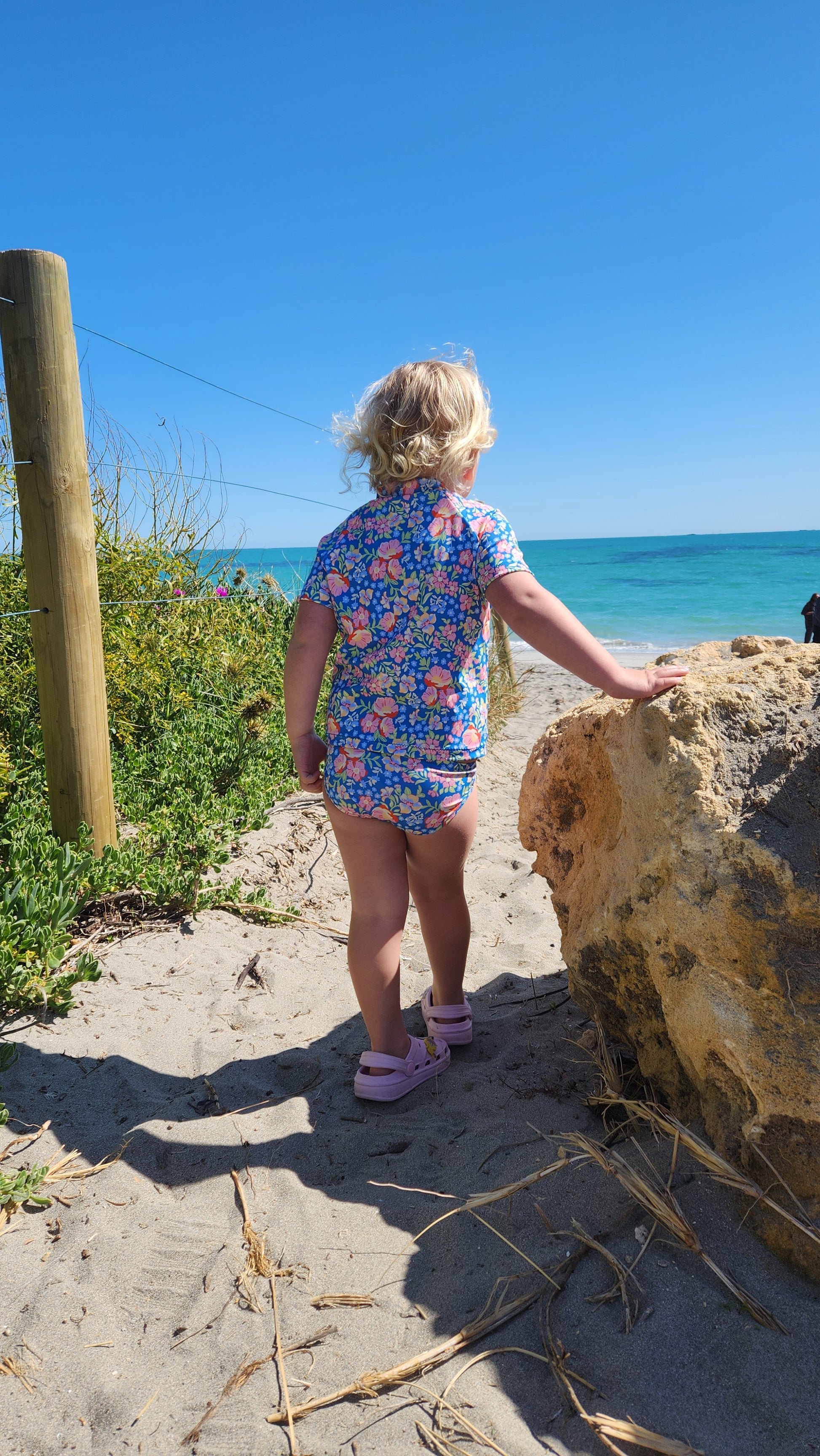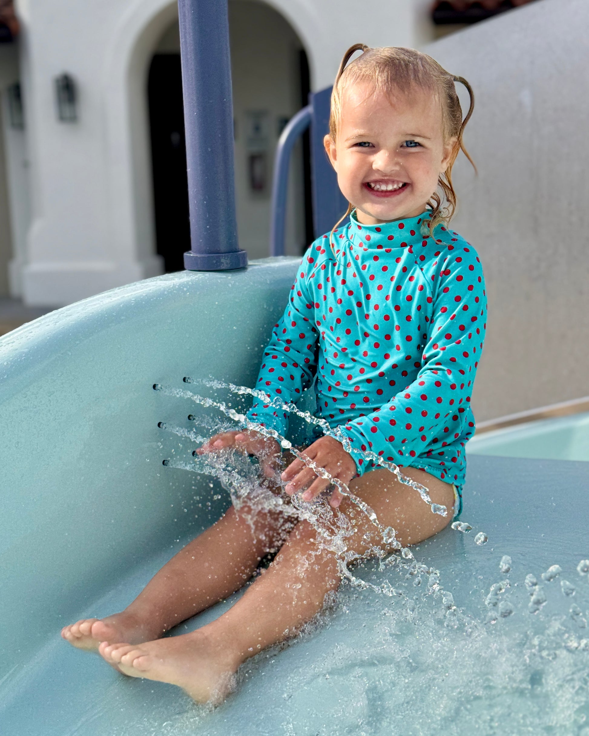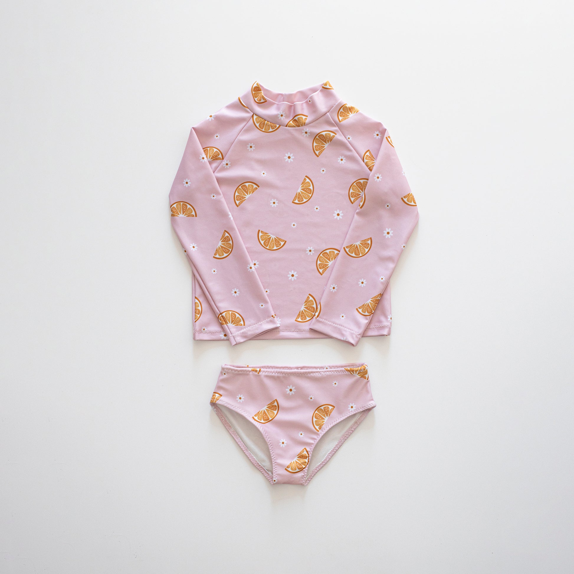 Meet Coconut, the playful two-piece swim pattern made for splashy adventures and all-day comfort. The set includes a long-sleeve top with easy-moving raglan sleeves and a neat mock neck and a classic bikini brief that’s fully lined with soft elastic at the waist and leg openings.